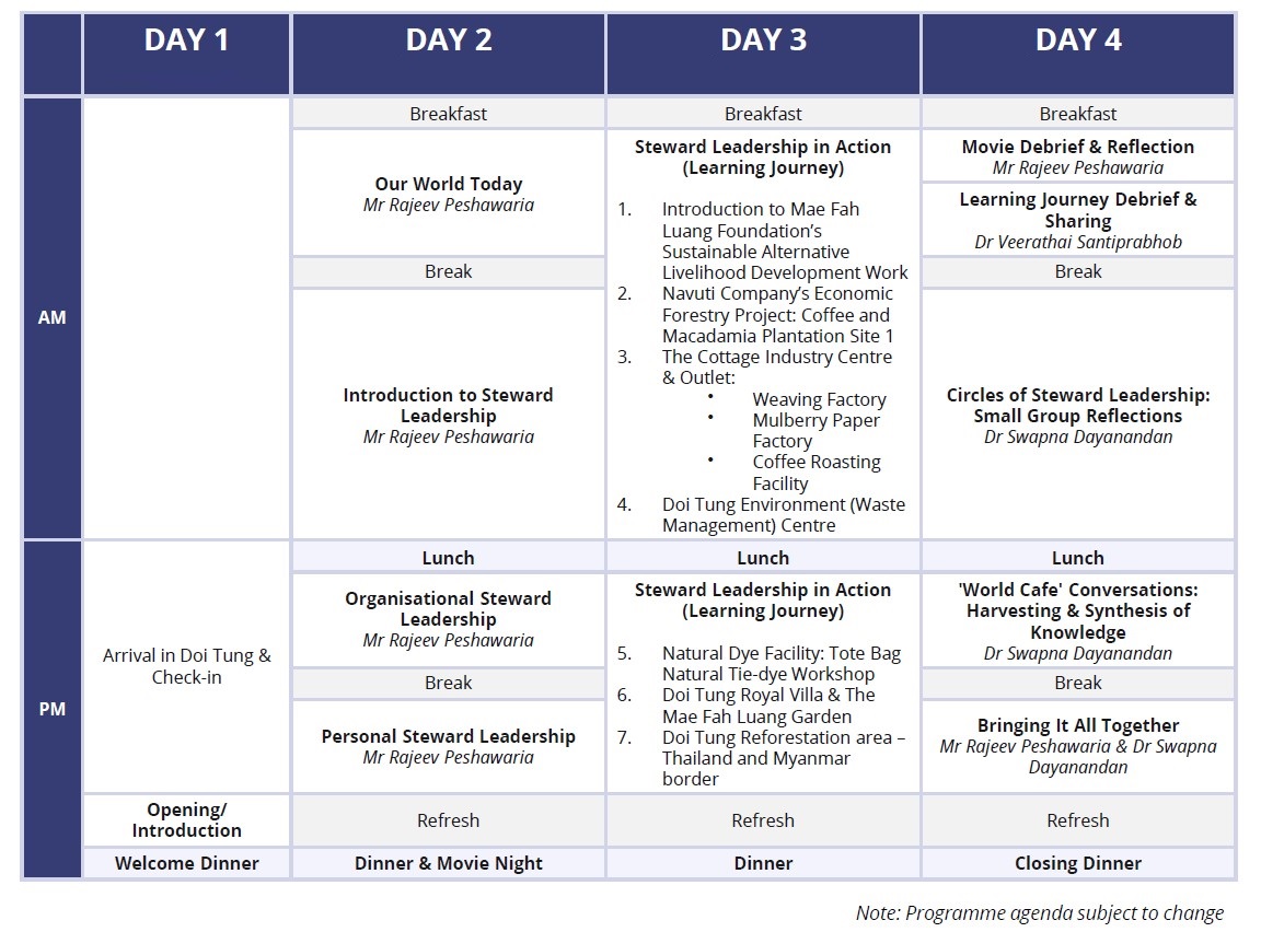 Get ready for a transformative five-day journey with our Steward Leadership Impact study tour at Doi Tung, where you will see and experience what steward leadership can achieve. Experience participatory workshops and interact with the local community to learn how businesses can pioneer innovative approaches to create profitable solutions to today's existential challenges.