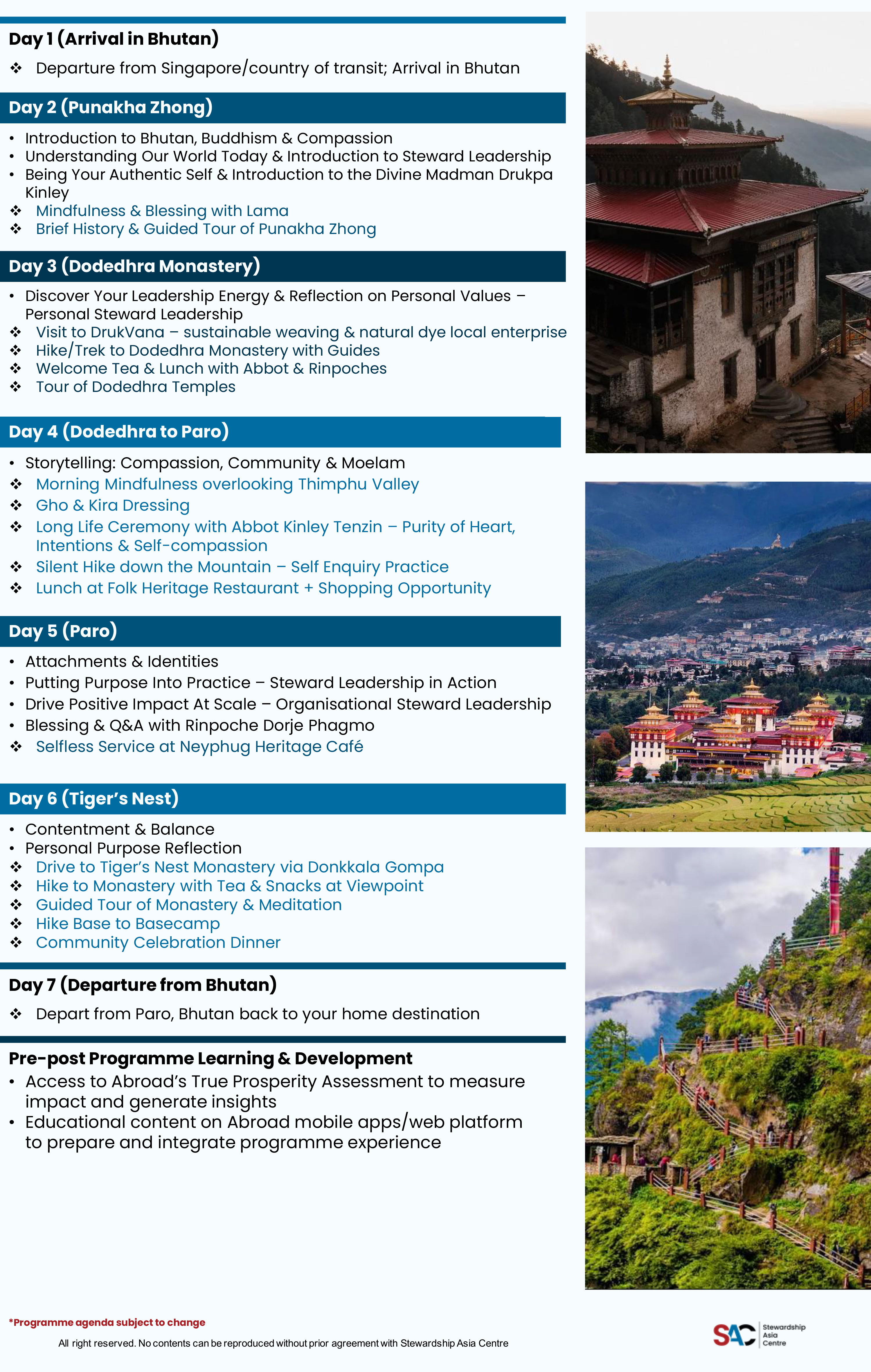 The programme is guided by a distinguished faculty blending deep expertise in Steward Leadership, Bhutanese cultural wisdom, and executive coaching, including SAC’s Rajeev Peshawaria, Bhutan’s Dr. Dorji Wangchuk and Lhaki Dolma, and Abroad’s founder and executive coach Justin Milano